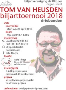 Het einde van het biljartseizoen nadert en dus zijn de voorbereidingen van het Tom van Heusden Biljarttoernooi 2018 al in volle gang.